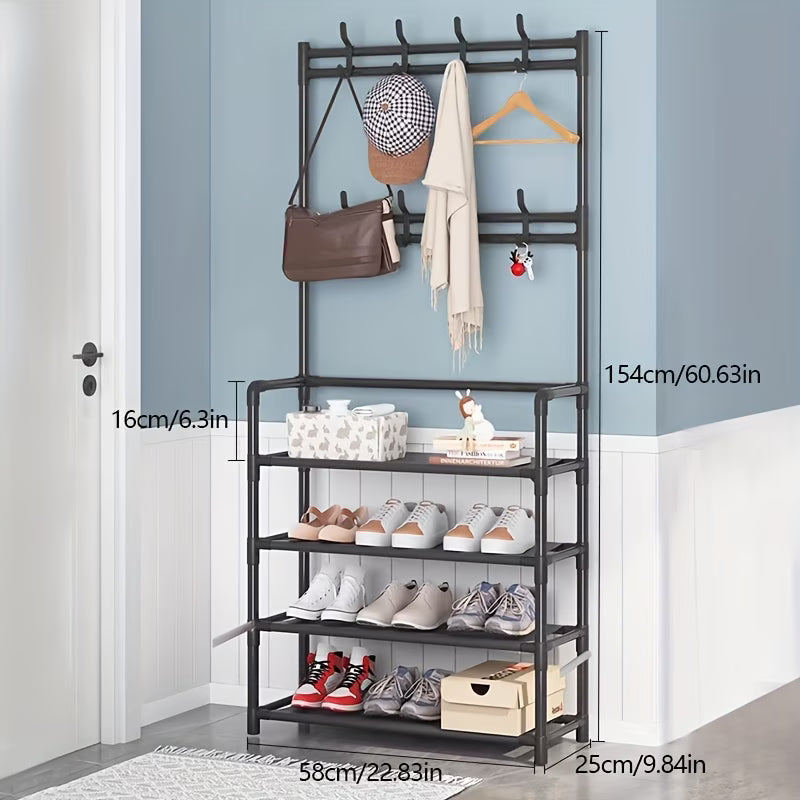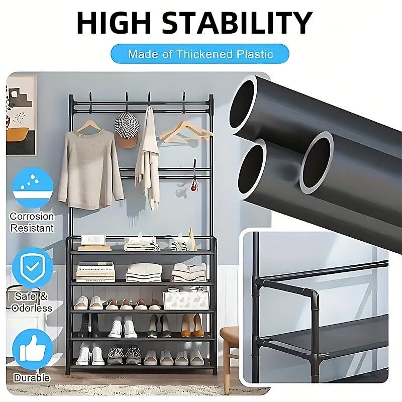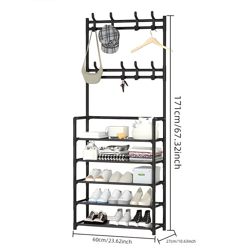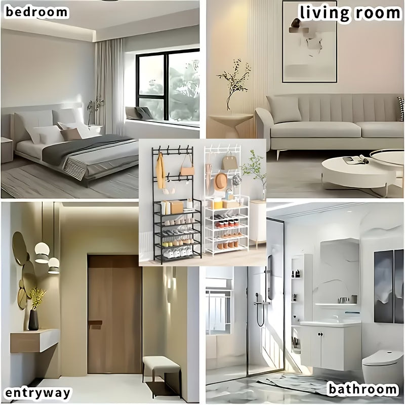Praktično rješenje za uredan i organizovan dom 🏠✨. Ovaj stalak omogućava pregledno odlaganje cipela, dok ugrađene kukice pružaju dodatni prostor za torbe, ključeve, jakne ili kišobrane 👜🧥🔑.